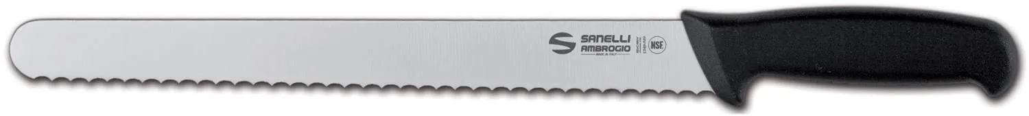 Coltello panettiere , lama da 32 cm Manico nero in elastomero TPE,lama satinata in acciaio inox speciale all'azoto Linea di coltelleria espressamente studiata per l'utilizzo professionale: alla consueta elevata qualità delle lame, prodotte con i migliori acciai Bonpertuis® specifici per coltelleria, abbina impugnature ergonomiche in polipropilene (PP) e gomma termoplastica. I materiali utilizzati sono sterilizzabili, resistenti alla corrosione ed alle elevate temperature, e sono conformi alle normative vigenti in tema di igiene e sicurezza alimentare.