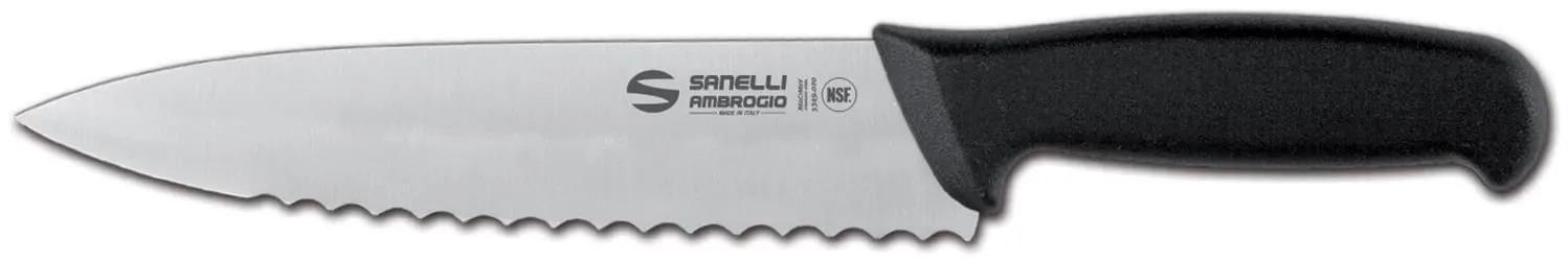 Coltello trinciare dentato , lama da 24 cm Manico nero in elastomero TPE,lama satinata in acciaio inox speciale all'azoto Linea di coltelleria espressamente studiata per l'utilizzo professionale: alla consueta elevata qualità delle lame, prodotte con i migliori acciai Bonpertuis® specifici per coltelleria, abbina impugnature ergonomiche in polipropilene (PP) e gomma termoplastica. I materiali utilizzati sono sterilizzabili, resistenti alla corrosione ed alle elevate temperature, e sono conformi alle normative vigenti in tema di igiene e sicurezza alimentare.