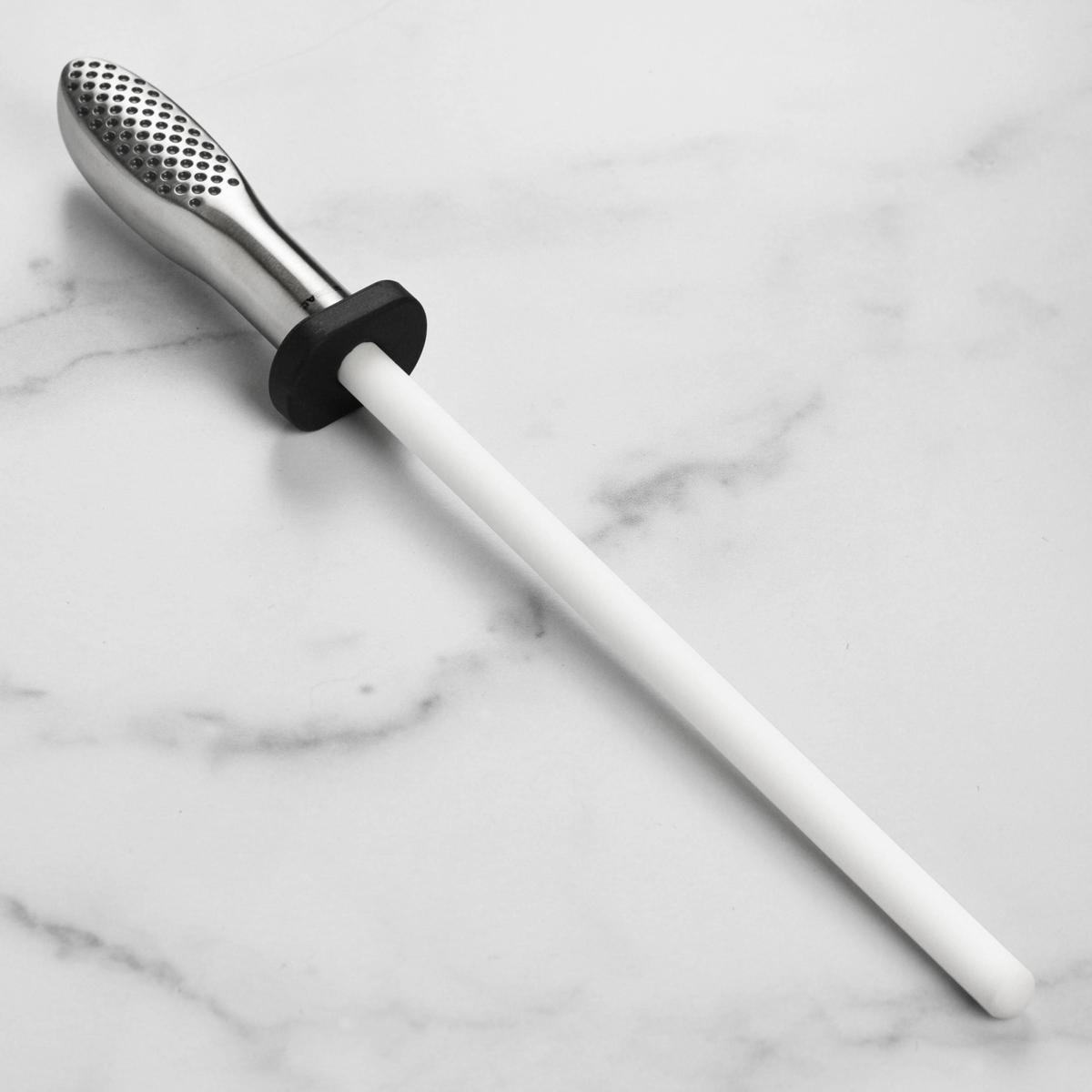 Acciaino Affilacoltelli in ceramica G74 di Global. Meno abrasivo di una versione diamantata, questo acciaino costrutito in ceramica è per affilare ii vostri coltelli ed è approssimativamente equivalente a una pietra per affilare di grana 3000, senza essere così laborioso da utilizzare. Lunghezza cm. 22