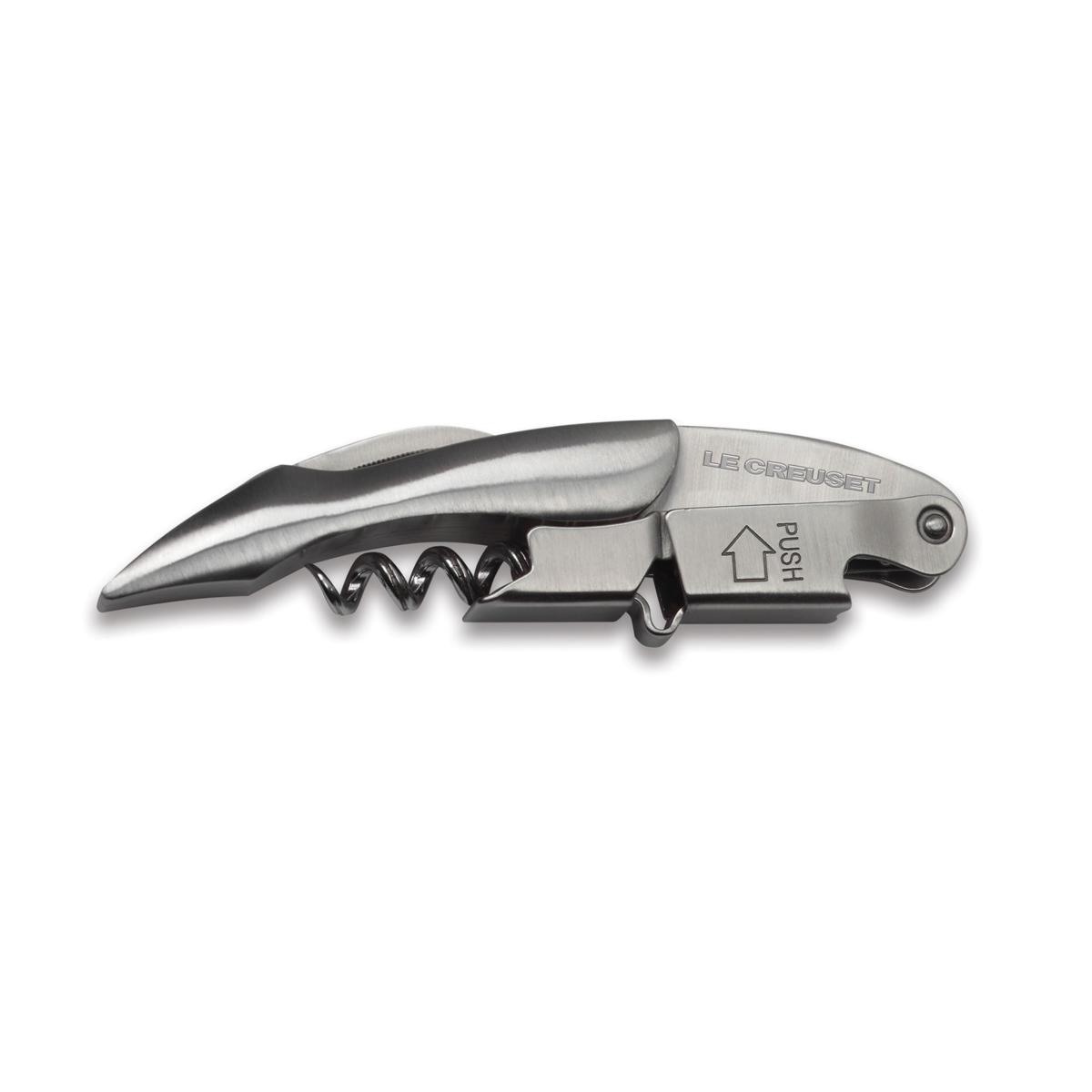 Cavatappi sommelier in alluminio satinato con doppia leva per un'estrazione in due tempi. Con una lama per tagliare la capsula. Dimensioni: 12 cm