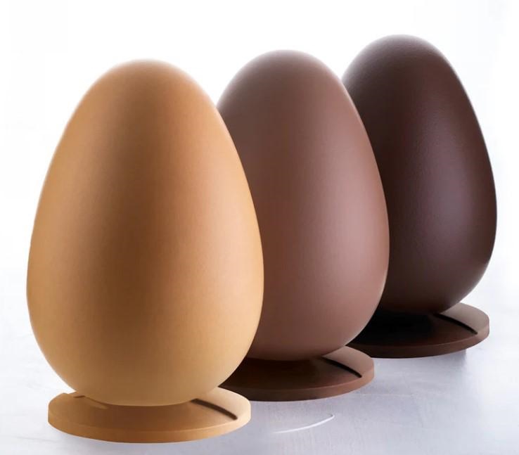 Kit di 3 stampi termoformati per la realizzazione di uova di cioccolato, delle misure di Ø 13,8 cm H 21,6 cm e del peso di 400 gr ciascuno. Il kit contiene 9 pezzi per realizzare 3 uova, complete anche della relativa base. kit di 9 pezzi per 3 uova con base complete Misure: Ø 13,8 cm H 21,6 cm Peso del prodotto realizzato: 400 gr circa Materiale: PVC di alta qualità.